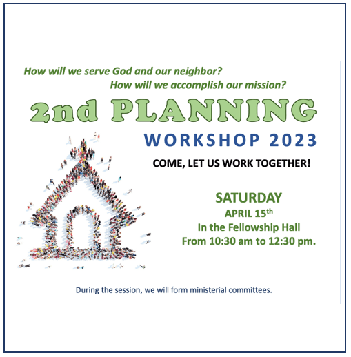Our church will meet again on Saturday, April 15, to finish the Planning Workshop 2023 with the purpose of formulating a vision and strategic actions to better fulfill our mission in the community of Franklinton.This will be the second workshop and we hope to gather the majority of our membership to work together for two … Continue reading In April